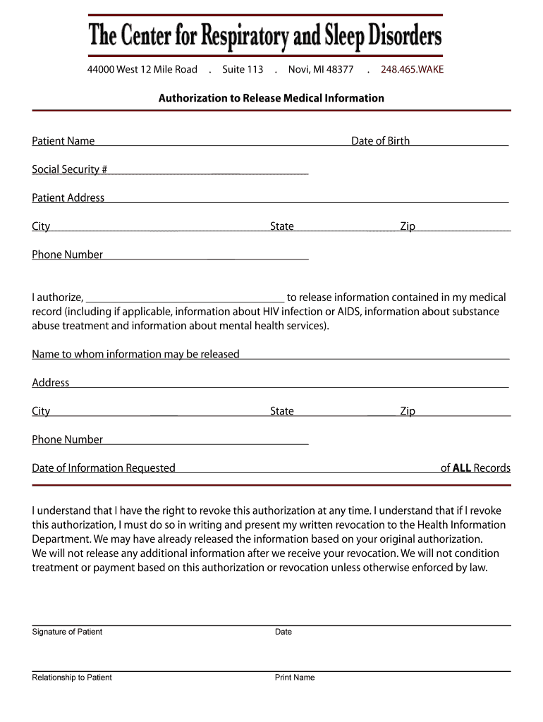 44000 West 12 Mile Road. Suite 113. Nova, MI 48377. 248.465.WAKE Authorization to Release Medical Information SLEEP QUESTIONNAIRE Your answers to the following questions will help us to obtain a better