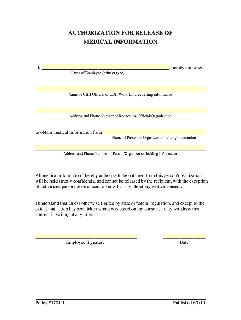 AUTHORIZATION FOR RELEASE OF MEDICAL INFORMATION I, hereby authorize Name of Employee (print or type) Name of CBH Official or CBH Work Unit requesting information Address and Phone Number of Requesting