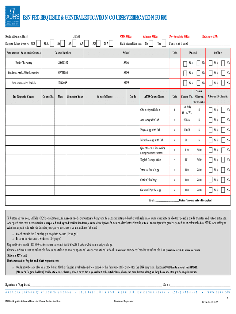BSN PREREQUISITE & GENERAL EDUCATION COURSE VERIFICATION FORM Student Name: Last, First CUM GPA: Science GPA: Prerequisite GPA: Entrance GPA: Degree (check one) : M.S.M.A.BSBAAAASN/Professional License:Noyes