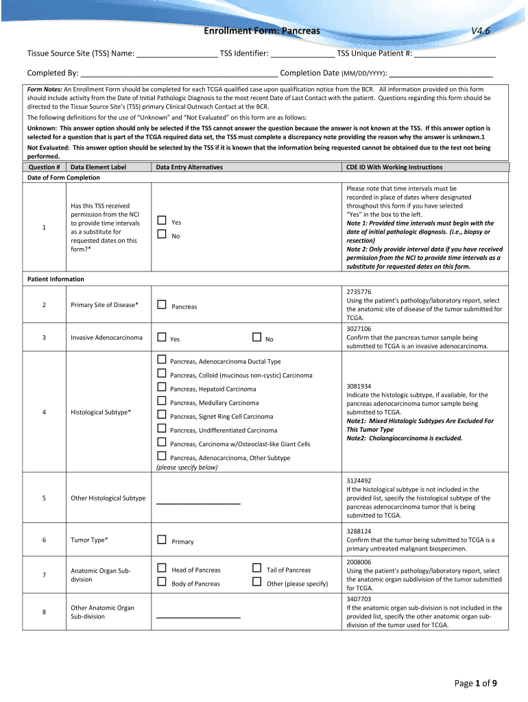 V4.6Enrollment Form: PancreasTissue Source Site (TSS) Name: TSS Identifier: TSS Unique Patient #: Completed By: Completion Date (MM/DD/YYY): Form Notes: An Enrollment Form should be completed for