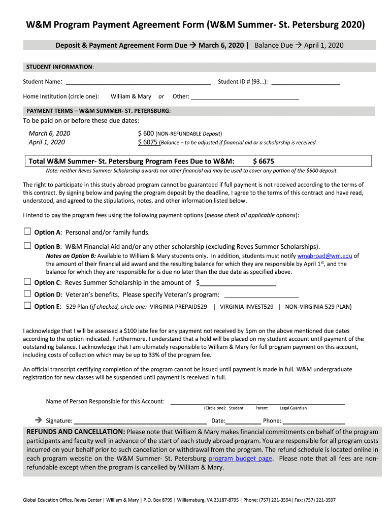 W&M Program Payment Agreement Form (W&M Summer St. Petersburg 2020) Deposit & Payment Agreement Form Due March 6, 2020, Balance Due April 1, 2020, STUDENT INFORMATION: Student Name: Student ID # (93):