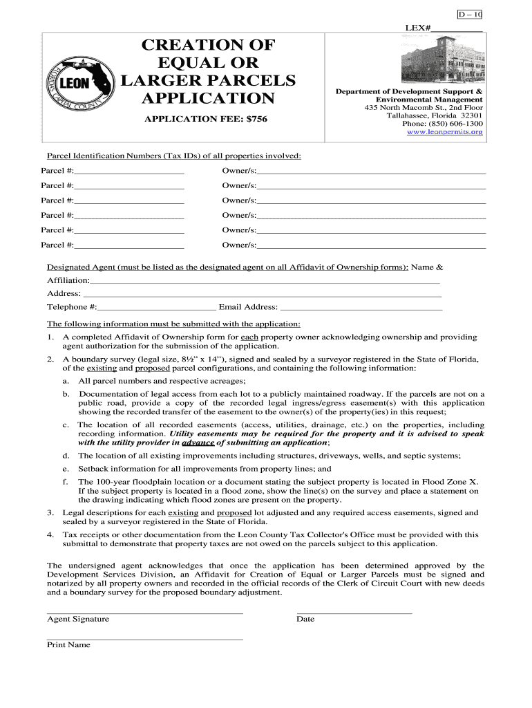 D 10LEX#CREATION OF EQUAL OR LARGER PARCELS APPLICATIONDepartment of Development Support & Environmental Management 435 North Macomb St., 2nd Floor Tallahassee, Florida 32301 Phone: (850) 6061300