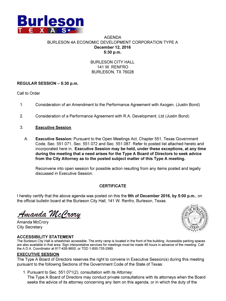 AGENDA BURLESON 4A ECONOMIC DEVELOPMENT CORPORATION TYPE A December 12, 2016 5:30 p.m. BURLESON CITY HALL 141 W. RENO BURLESON, TX 76028 REGULAR SESSION 5:30 p.m. Call to Order 1. Consideration of