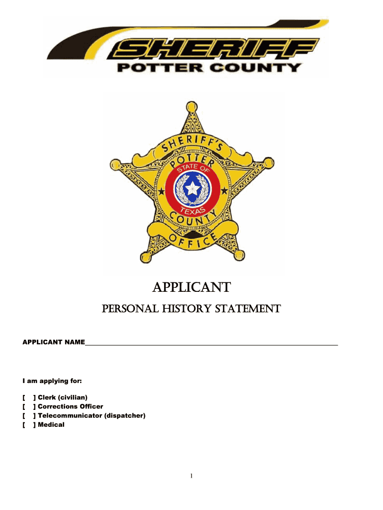 APPLICANT PERSONAL HISTORY STATEMENT APPLICANT NAME am I applying for: Clerk (civilian) Corrections Officer Telecommunication (dispatcher) Medical1APPLICANT MINIMUM REQUIREMENTS Prior to being considered