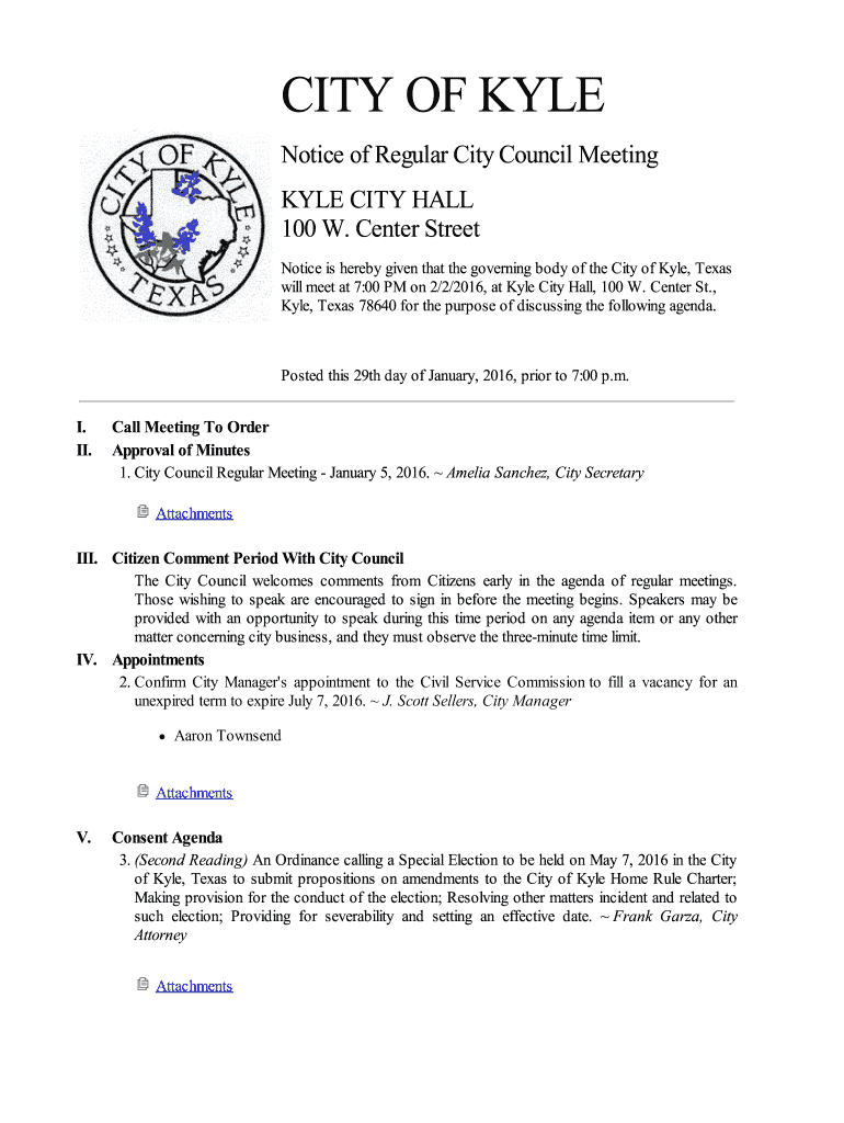 CITY OF KYLE Notice of Regular City Council Meeting KYLE CITY HALL 100 W. Center Street Notice is hereby given that the governing body of the City of Kyle, Texas will meet at 7:00 PM on 2/2/2016,