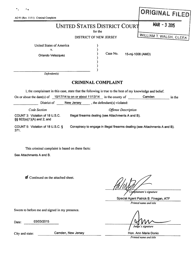 ORIGINAL 91 (Rev. II/II) Criminal Complaint MAR 3 2015UNITED STATES DISTRICT COUR1for William T. WALSH, CLERKDISTRICT OF NEW JERSEY)))))))United States of American. Orlando VelazquezFILED)Case No.15mj1008