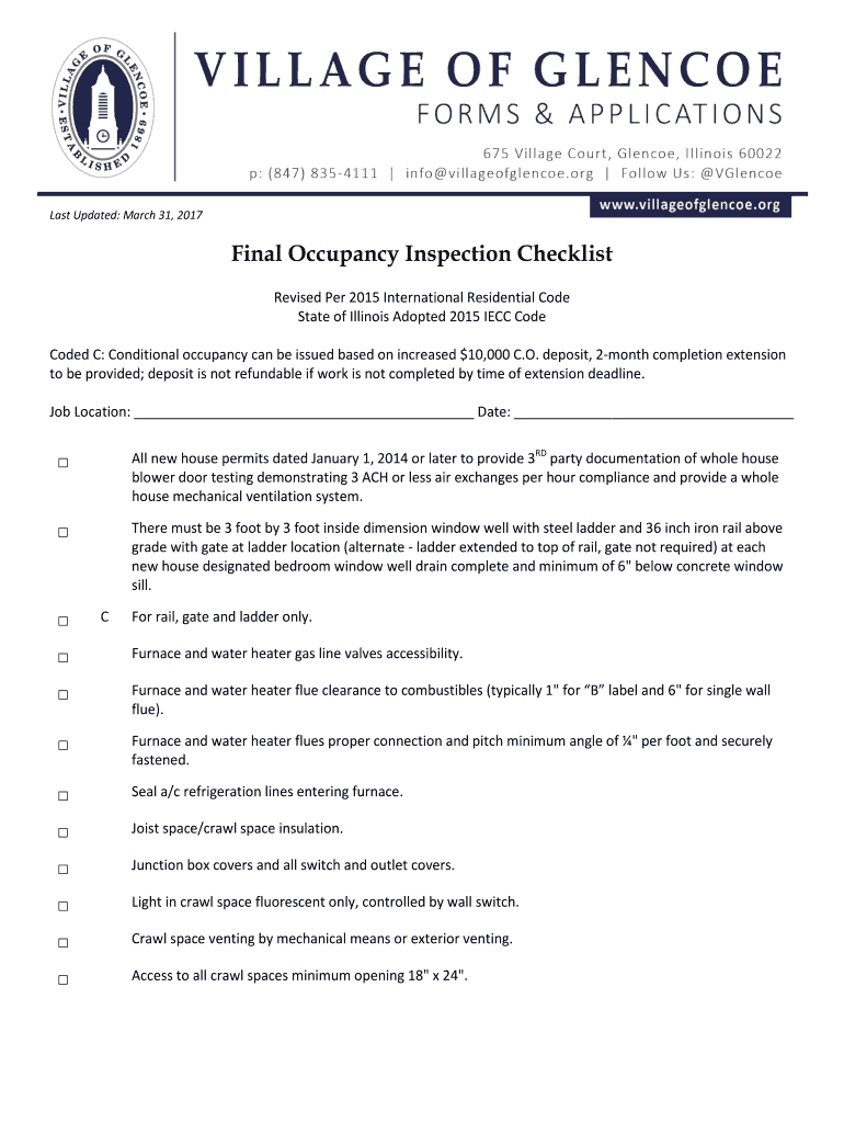 Last Updated: March 31, 2017Final Occupancy Inspection Checklist Revised Per 2015 International Residential Code State of Illinois Adopted 2015 IEC Code Coded C: Conditional occupancy can be issued