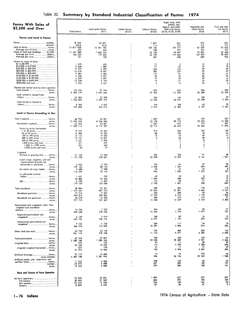 Table 32. Summary by Standard Industrial Classification of Farms: Farms With Sales of $2,500 and Over1974Sugar crop, Irish potato. How, peanut, and other field crop forms (0133,0134,0139)Vegetable