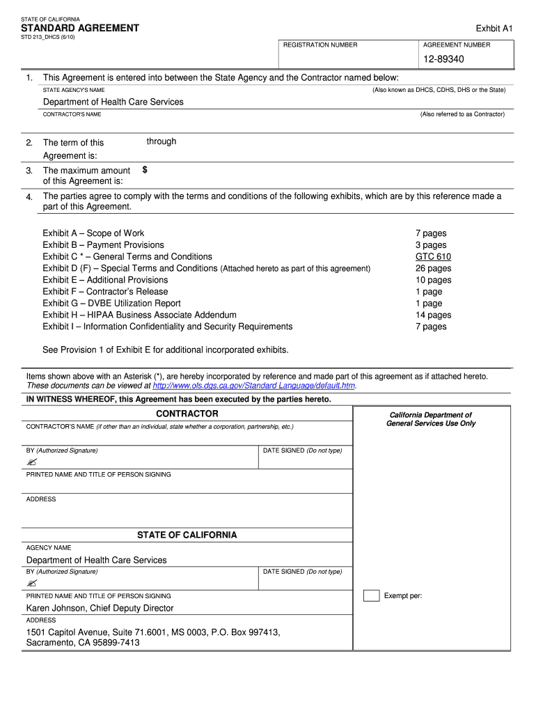STATE OF CALIFORNIASTANDARD AGREEMENTExhbit A1STD 213_DOCS (6/10)REGISTRATION NUMBERAGREEMENT NUMBER1289340