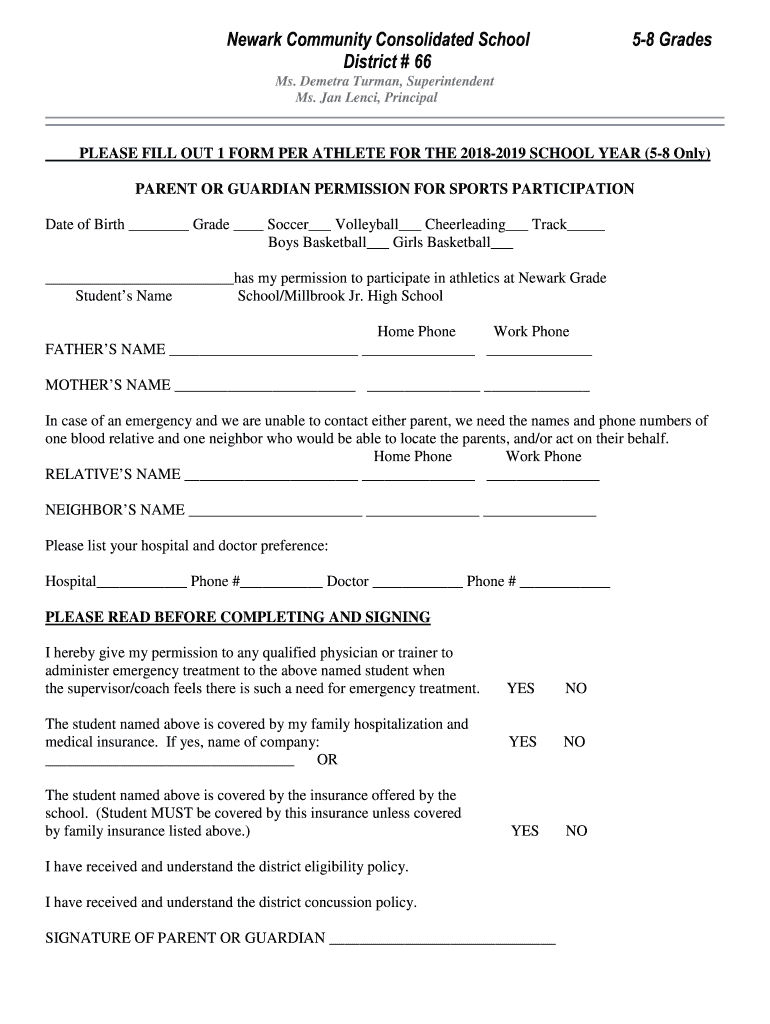 Newark Community Consolidated School District # 6658 Grades Ms. Dementia Truman, Superintendent Ms. Jan Hence, PrincipalPLEASE FILL OUT 1 FORM PER ATHLETE FOR THE 20182019 SCHOOL YEAR (58 Only) PARENT