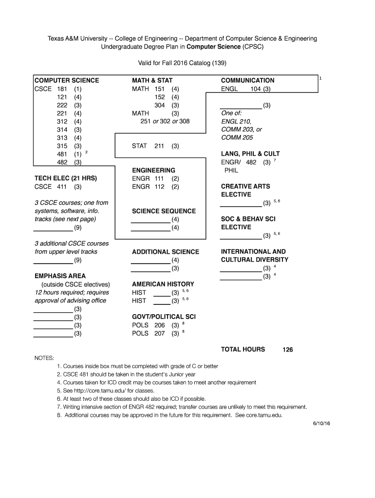 Texas A&M University College of Engineering Department of Computer Science & Engineering Undergraduate Degree Plan in Computer Science (CPC) Valid for Fall 2016 Catalog (139) COMPUTER SCIENCE CSC