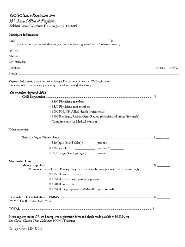 EMMA Registration form 38th Annual Clinical Conference Kalahari Resort, Wisconsin Dells, August 1114, 2016 Participant Information Name Title: (Enter name as you would like it to appear on your name