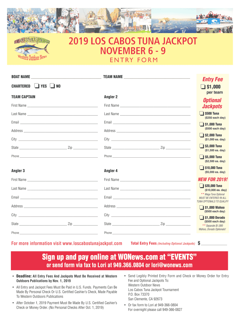 2019 LOS CABOT TUNA JACKPOT NOVEMBER 6 9 E N T RY F O RM BOAT NAME TEAM NAME Chartered YES o Not $1,000per teamed CAPTAINAngler 2First Name First Name Last Name Email Address City State Zip Phone