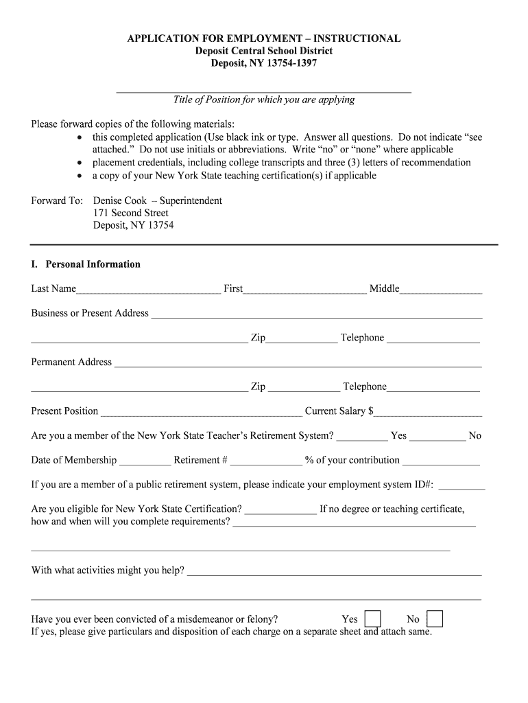 APPLICATION FOR EMPLOYMENT INSTRUCTIONAL Deposit Central School District Deposit, NY 137541397 Title of Position for which you are applying Please forward copies of the following materials: this completed