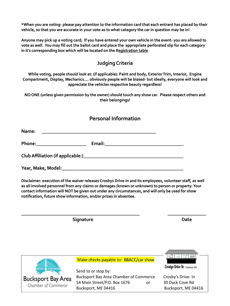 Buck sport Bay Festival 2019 Auto Show *SUNDAY* July 21st 2019 Sponsored by Crosby's DriveInRegistration Form You can Preregister at the Buck sport Chamber of Commerce or Crosby's Driven; Registration