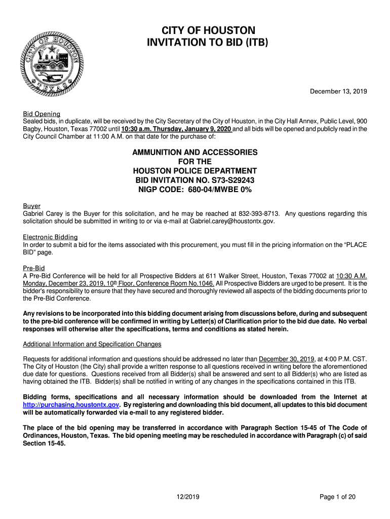 Sealed bids, in duplicate, will be received by the City Secretary of the City of Houston, in the City Hall Annex, Public Level,