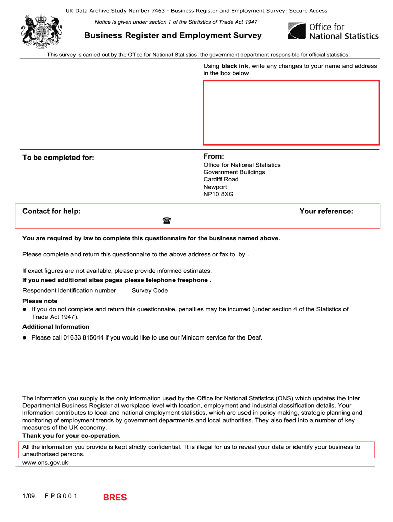 UK Data Archive Study Number 7463 Business Register and Employment Survey: Secure Accessorize is given under section 1 of the Statistics of Trade Act 1947Business Register and Employment Survey This