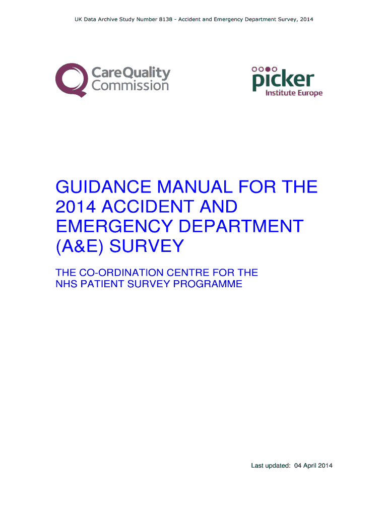 UK Data Archive Study Number 8138 Accident and Emergency Department Survey, 2014GUIDANCE MANUAL FOR THE 2014 ACCIDENT AND EMERGENCY DEPARTMENT (A&E) SURVEY THE COORDINATION Center FOR THE NHS PATIENT