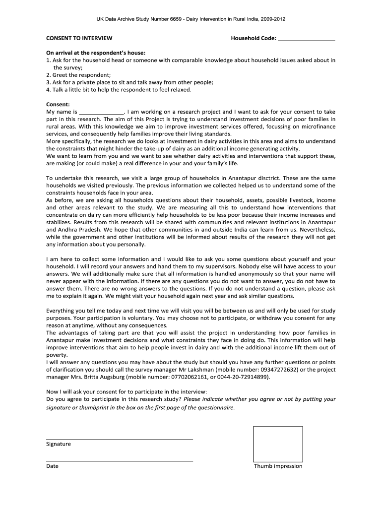 UK Data Archive Study Number 6659 Dairy Intervention in Rural India, 20092012CONSENT TO INTERVIEWHousehold Code: On arrival at the respondents house: 1. Ask for the household head or someone with