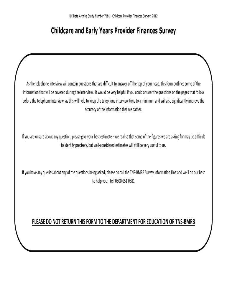 UK Data Archive Study Number 7181 Childcare Provider Finances Survey, 2012Childcare and Early Years Provider Finances Surveys the telephone interview will contain questions that are difficult to answer