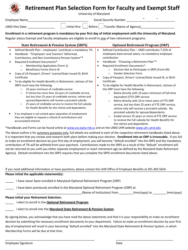 PRINTRESETRetirement Plan Selection Form for Faculty and Exempt Staff University of Maryland Employee Name UMD Hire Date: Social Security Number Initial Hire Rehire Transfer (Name of Agency) Enrollment