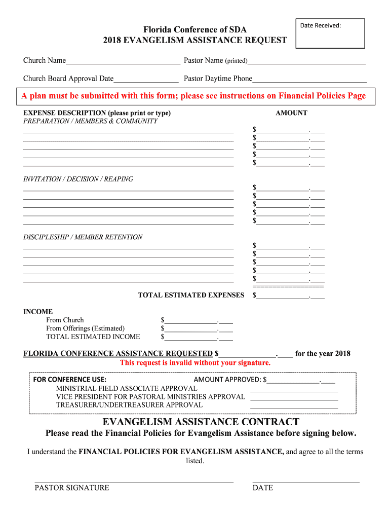 Florida Conference of SDA 2018 EVANGELISM ASSISTANCE Sequestrate Received:Church Name Pastor Name (printed) Church Board Approval Date Pastor Daytime Phone A plan must be submitted with this form;