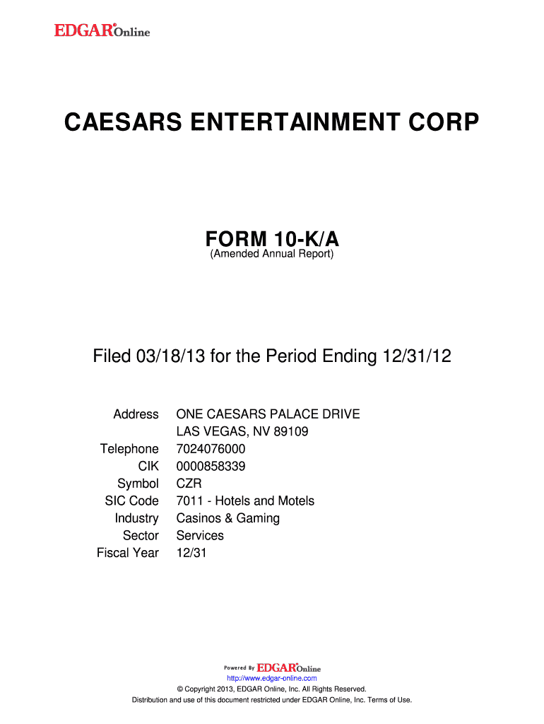 Get the free CAESARS ENTERTAINMENT CORP. FORM 10-K/A (Amended Annual Report) Filed 03/18/13 for t...