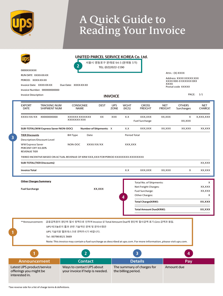A Quick Guide to Reading Your Invoice UNITED PARCEL SERVICE KOREA Co. Ltd.20000XXXXXX 943 (3) TEL: (02)20221190Attn.: (X) XXXXRUN DATE XXXXXXXXAddress XXX XXXIX XXX 0000 XXX 0XX XXX Postal code XXXXXPERIOD: