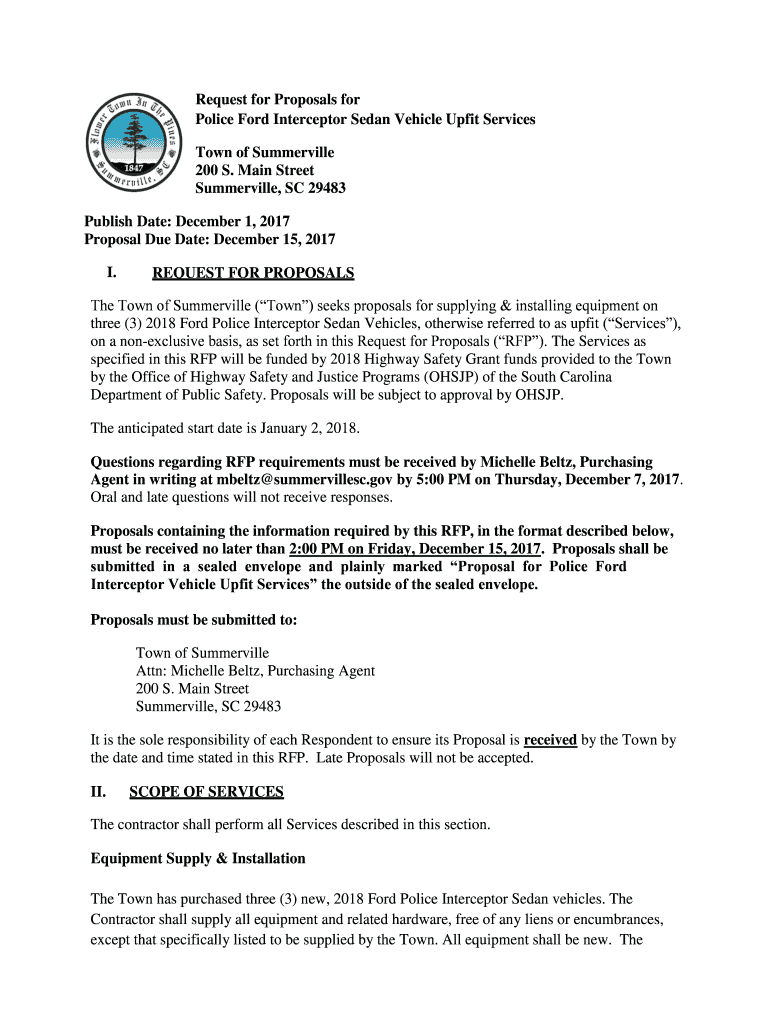 Request for Proposals for Police Ford Interceptor Sedan Vehicle Unfit Services Town of Summerville 200 S. Main Street Summerville, SC 29483 Publish Date: December 1, 2017, Proposal Due Date: December