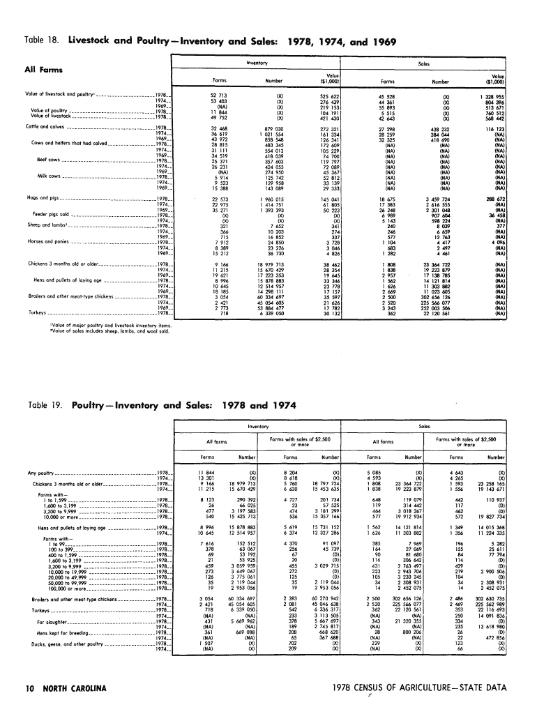 Table 18.livestock and Poultry Inventory and Sales:1978, 1974, and 1969InventorySolesAll Farms Value of livestock and poultry 1978 1974 1969 :: : C!k 1978 1978 Humber52 713 53 403(X) (X) (X) (X) (X)525