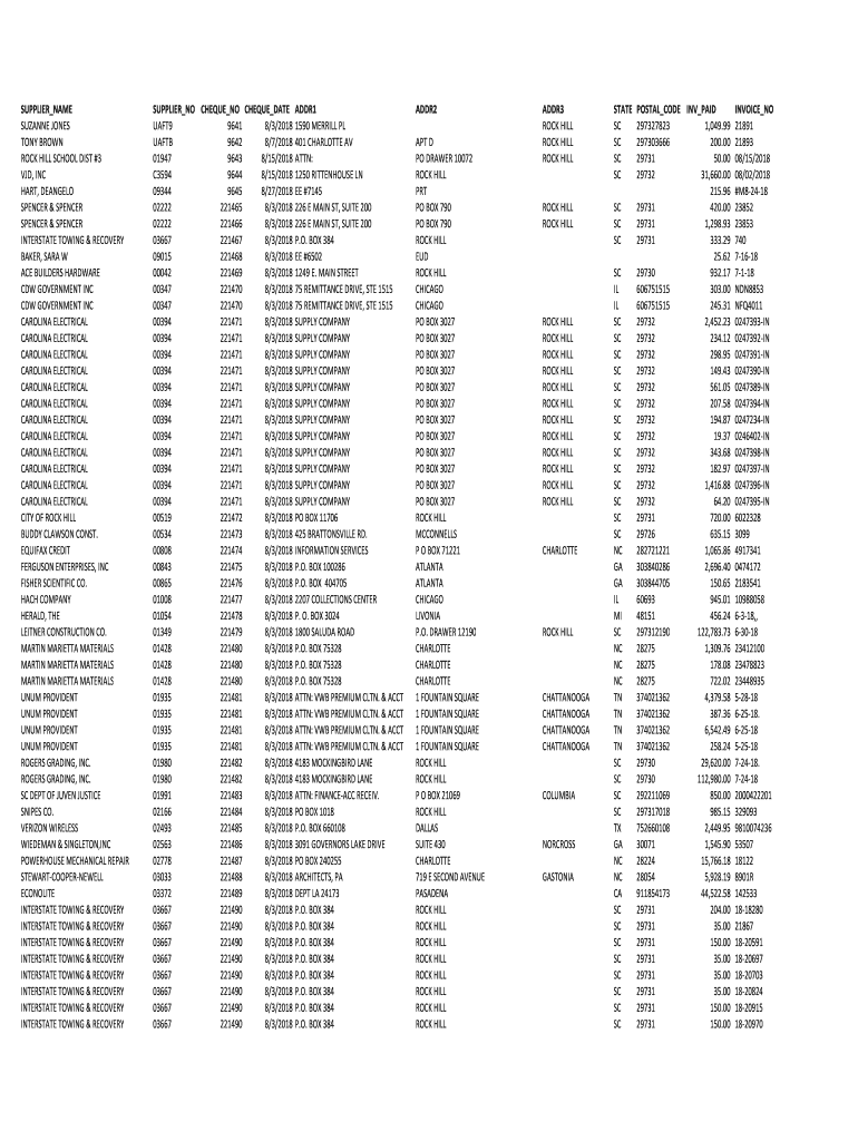 SUPPLIER NAME SUZANNE JONES TONY BROWN ROCK HILL SCHOOL DIST #3 JD, INC HART, ANGELO SPENCER & SPENCER & SPENCER INTERSTATE TOWING & RECOVERY BAKER, SARA W ACE BUILDERS HARDWARE CDW GOVERNMENT INC
