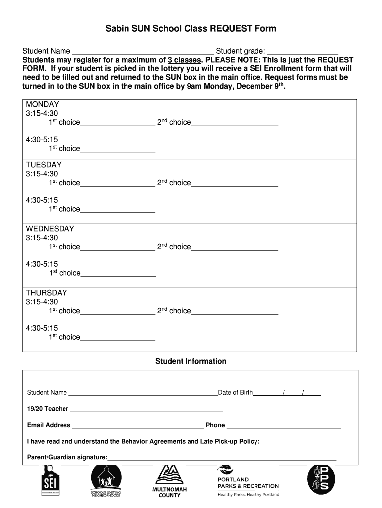 Sabin SUN School Class REQUEST Form Student Name Student grade: Students may register for a maximum of 3 classes. PLEASE NOTE: This is just the REQUEST FORM. If your student is picked in the lottery