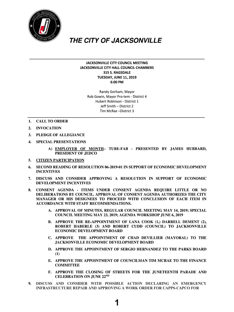 THE CITY OF JACKSONVILLE CITY COUNCIL MEETING JACKSONVILLE CITY HALL COUNCIL CHAMBERS 315 S. RANDALL TUESDAY, JUNE 11, 2019 6:00 PM Randy Gotham, Mayor Rob Gown, Mayor Wrote District 4 Hubert Robinson
