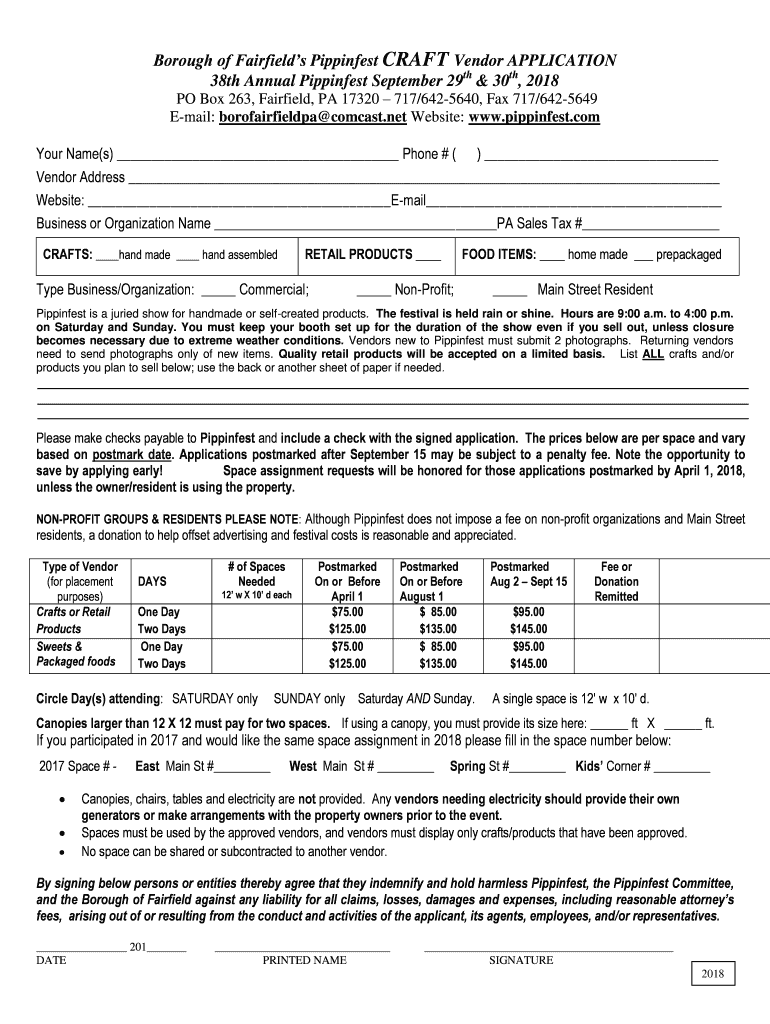 Borough of Fairfield's Pippin fest CRAFT Vendor APPLICATION 38th Annual Pippin fest September 29th & 30th, 2018 PO Box 263, Fairfield, PA 17320 717/6425640, Fax 717/6425649 Email: borofairfieldpa