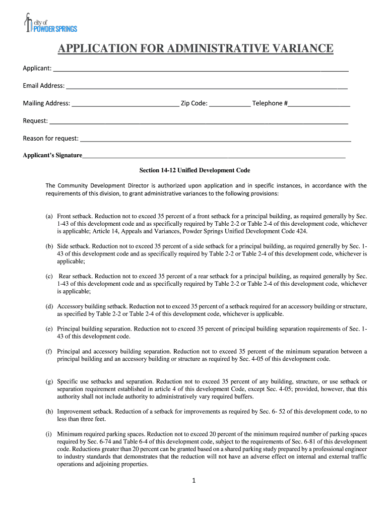 APPLICATION FOR ADMINISTRATIVE VARIANCE Applicant: Email Address: Mailing Address: Zip Code: Telephone # Request: Reason for request: Applicants Signature Section 1412 Unified Development Code The
