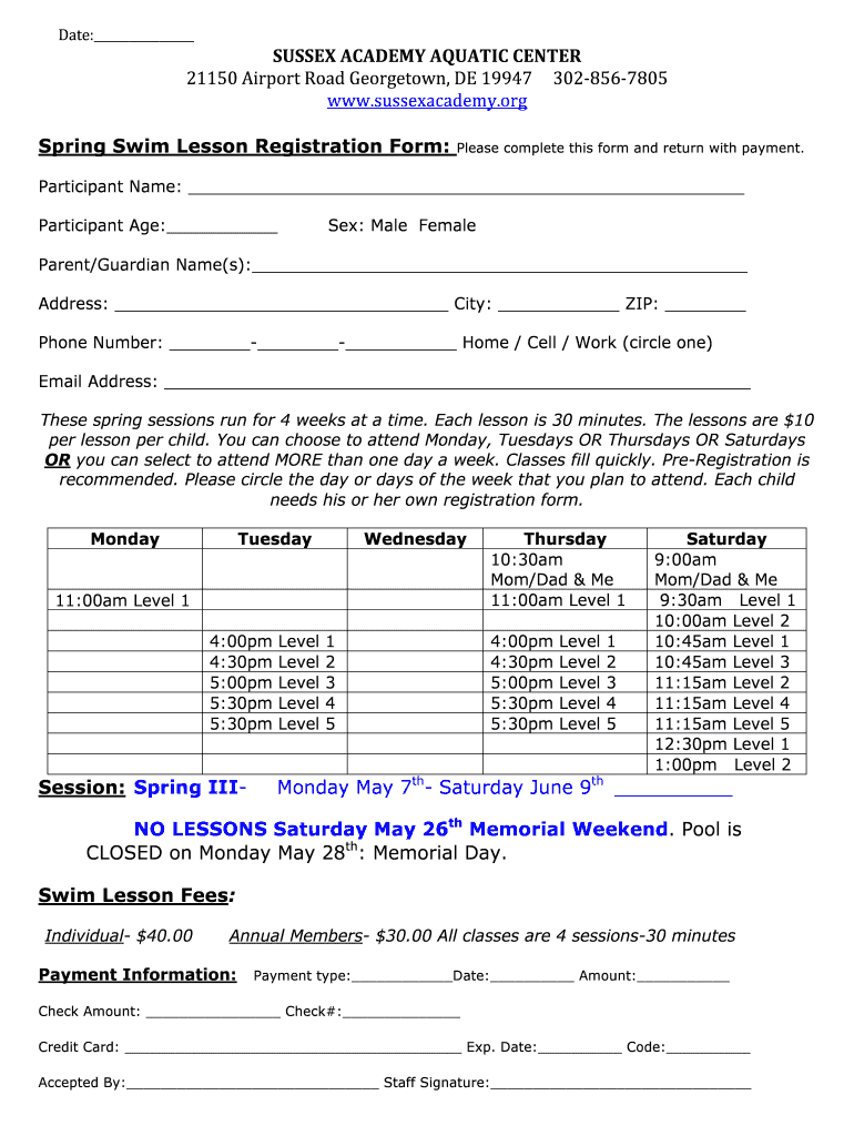 Date: SUSSEX ACADEMY AQUATIC CENTER21150 Airport Road Georgetown, DE 199473028567805www.sussexacademy.offspring Swim Lesson Registration Form: Please complete this form and return with payment. Participant