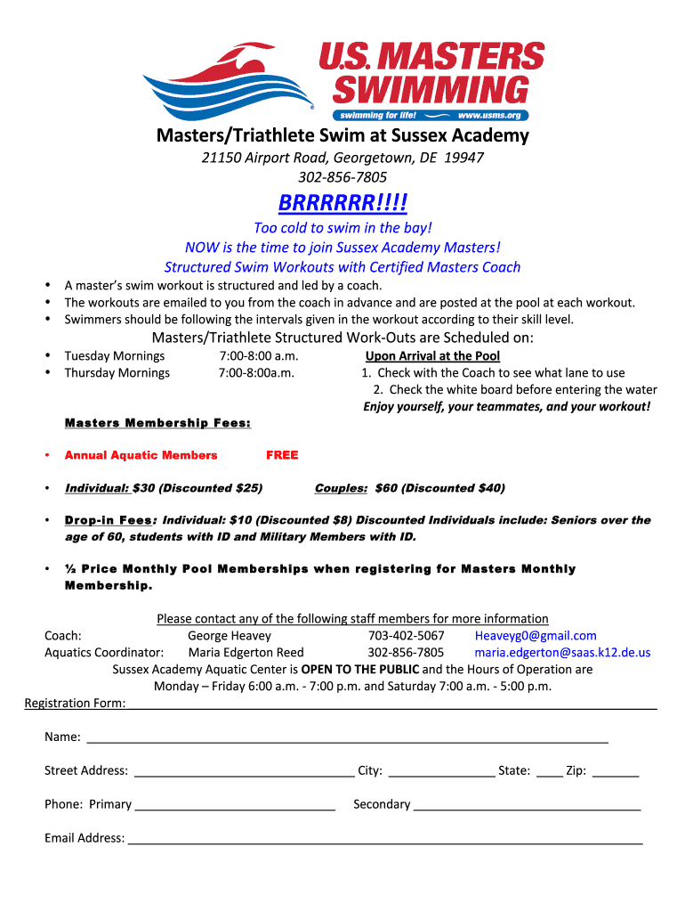 Masters/Triathlete Swim at Sussex Academy21150 Airport Road, Georgetown, DE199473028567805BRRRRRR!!!! Too cold to swim in the bay!NOW is the time to join Sussex Academy Masters! Structured Swim Workouts