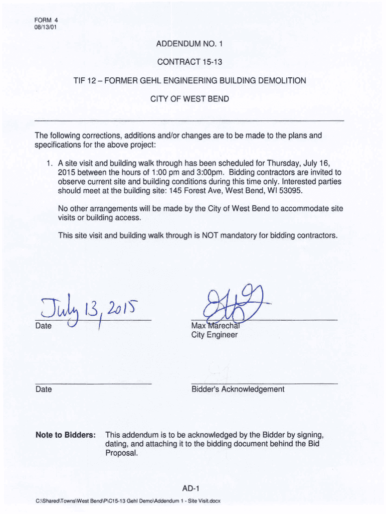 FORM 4 08/13/01ADDENDUM NO. 1 CONTRACT 1513 TIF 12 FORMER GEL ENGINEERING BUILDING DEMOLITION CITY OF WEST Bethe following corrections, additions and/or changes are to be made to the plans and specifications