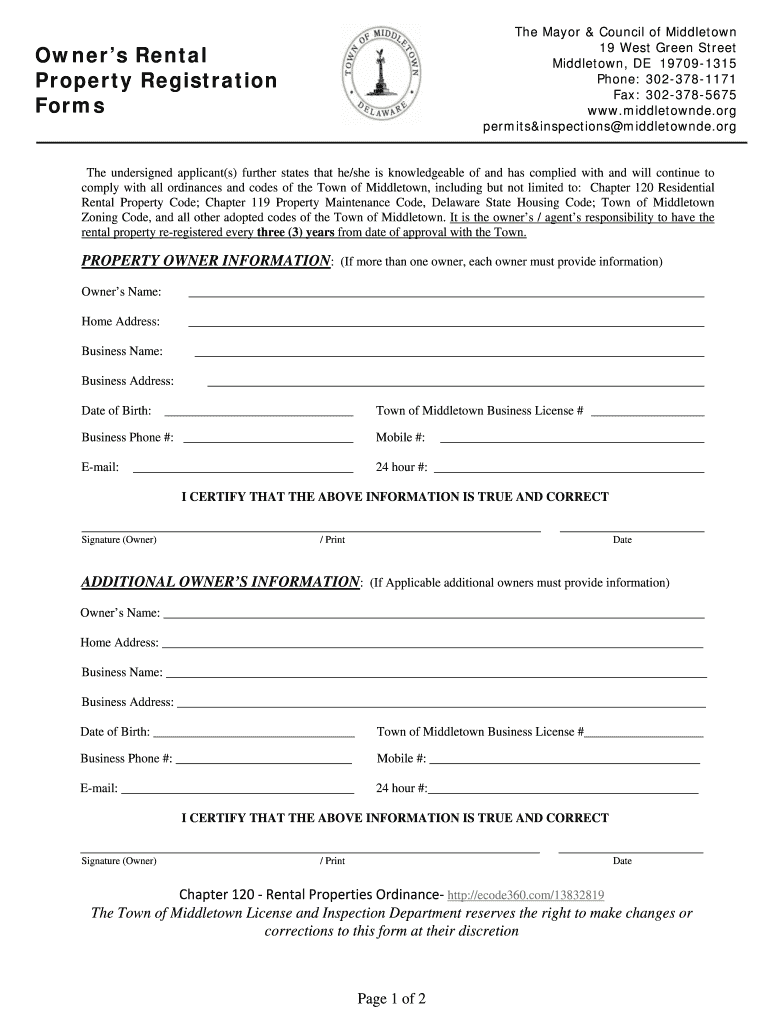 The Mayor & Council of Middletown 19 West Green Street Middletown, DE 197091315 Phone: 3023781171 Fax: 3023785675 www.middletownde.org permits&inspections Middletown. Owners Rental Property Registration