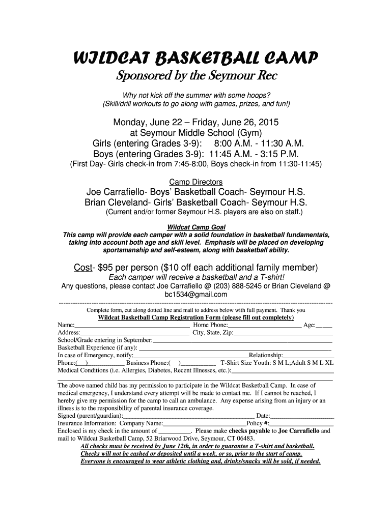 WILDCAT BASKETBALL CAMP Sponsored by the Seymour Rec Why not kick off the summer with some hoops? (Skill/drill workouts to go along with games, prizes, and fun!)Monday, June 22 Friday, June 26, 2015,