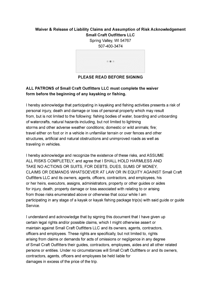 Waiver&ReleaseofLiabilityClaimsandAssumptionofRiskAcknowledgement SmallCraftOutfittersLLC Springville,WI54767 5074003474 PLEASEREADBEFORESIGNING ALLPATRONSofSmallCraftOutfittersLLCmustcompletethewaiver