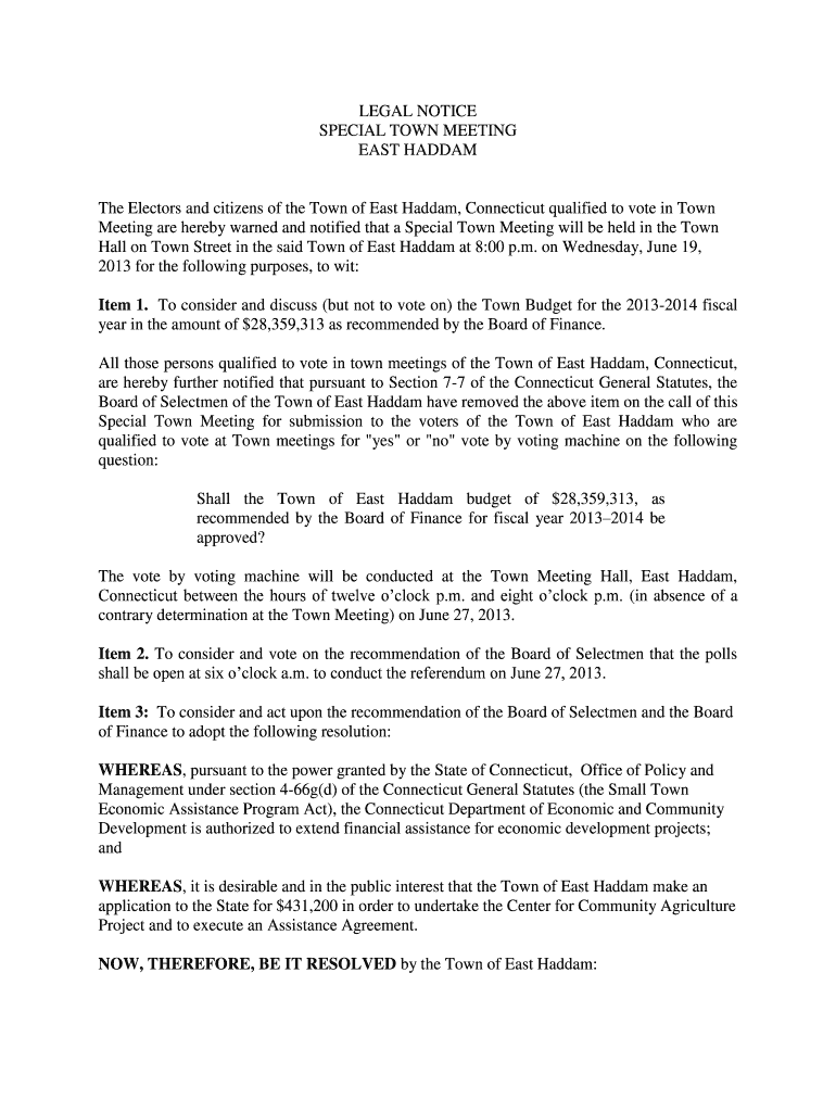 EAST HADDAMThe Electors and citizens of the Town of East Saddam, Connecticut qualified to vote in Town