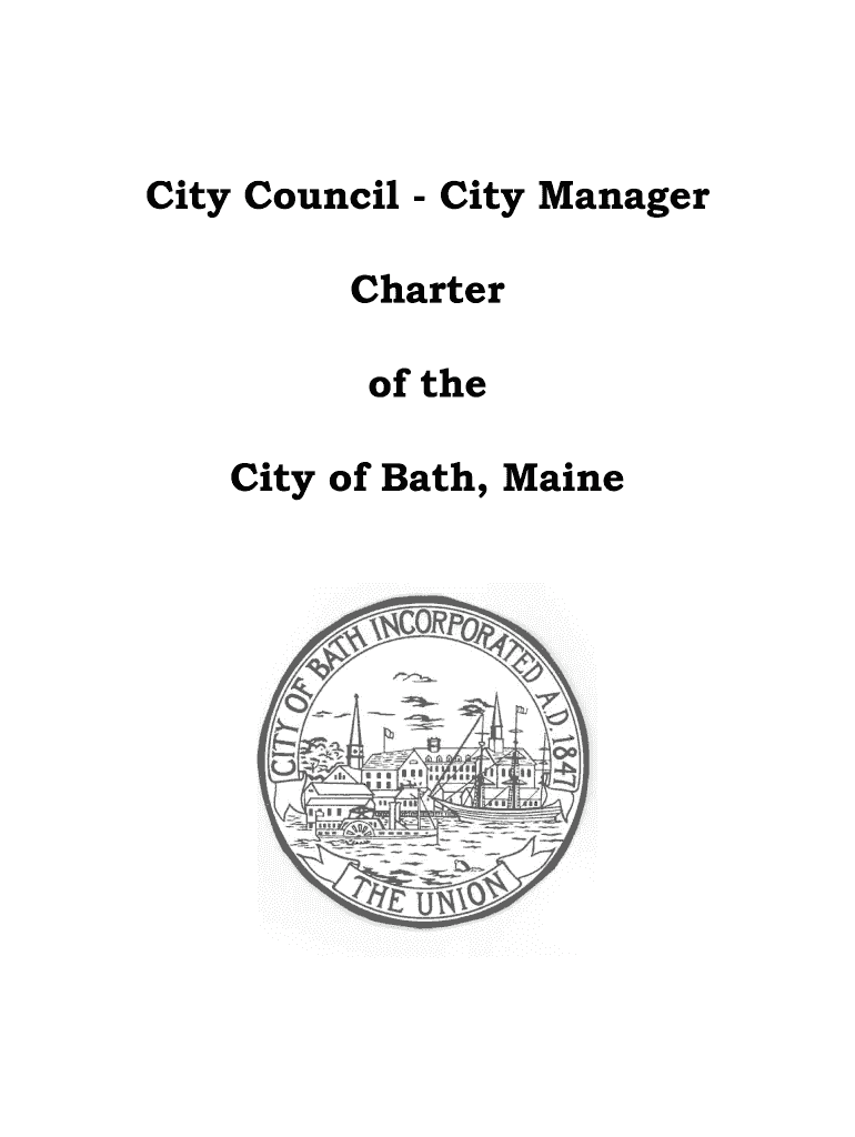City Council City Manager Charter of the City of Bath, MaineRevised CITY COUNCIL CITY MANAGER CHARTER City of Bath, MaineUpdated with revisions:June 10, 1980, December 3, 1980, July 2, 1982, November