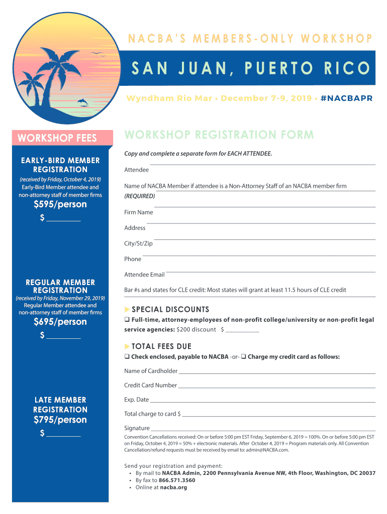 NAC BAS MEMBERSONLY WORKSHOP SAN JUAN, PUERTO RICO Wyndham Rio Mar December 79, 2019 #NACBAPRWORKSHOP FEES LADYBIRD MEMBER REGISTRATION (received by Friday, October 4, 2019) Early Bird Member attendee