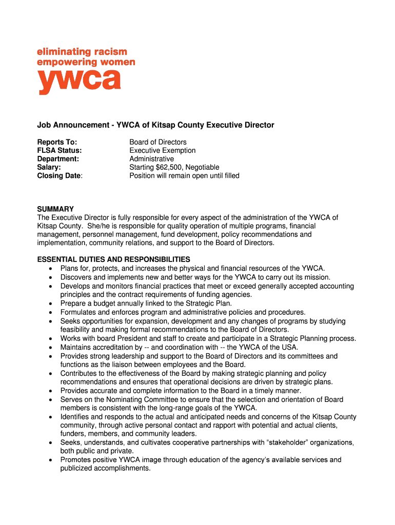 Get the free Job Announcement - YWCA of Kitsap County Executive Director