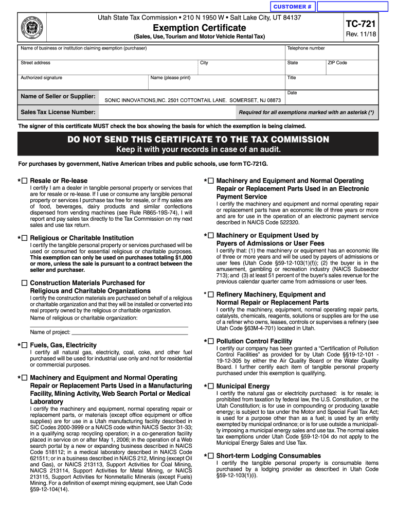 CUSTOMER #Utah State Tax Commission 210 N 1950 W Salt Lake City, UT 84137TC721Exemption Certificate Rev. 11/18(Sales, Use, Tourism and Motor Vehicle Rental Tax) Name of business or institution claiming