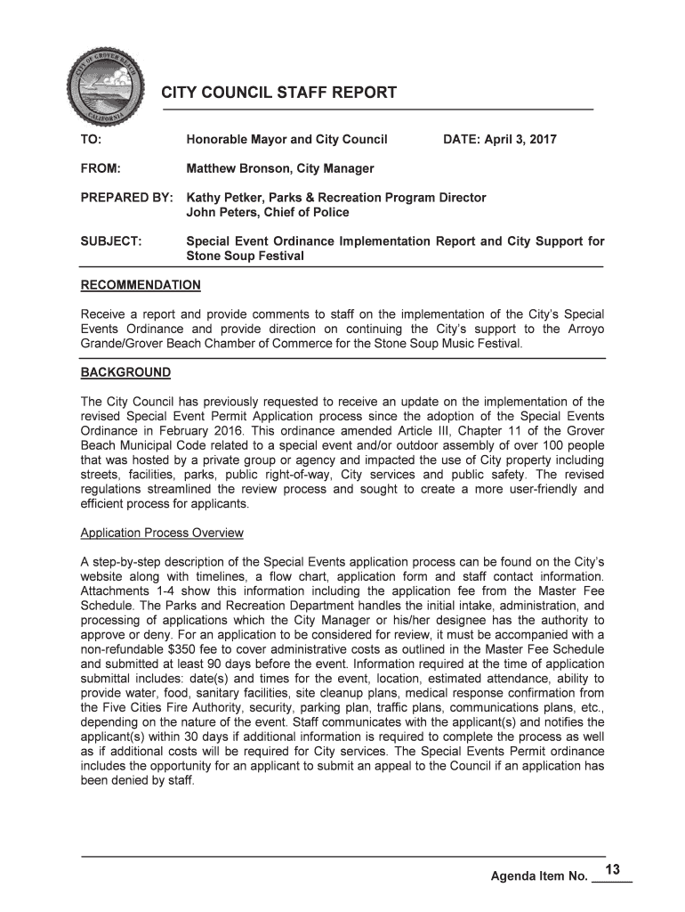 CITY COUNCIL STAFF REPORT TO:Honorable Mayor and City Conciliate: April 3, 2017FROM:Matthew Bronson, City ManagerPREPARED BY:Kathy Peter, Parks & Recreation Program Director John Peters, Chief of