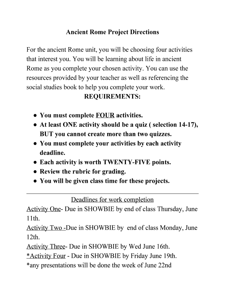 AncientRomeProjectDirections FortheancientRomeunit, youwillbechoosingfouractivities thatinterestyou. Youwillbelearningaboutlifeinancient Romeasyoucompleteyourchosenactivity. Youcanusethe resourcesprovidedbyyourteacheraswellasreferencingthe