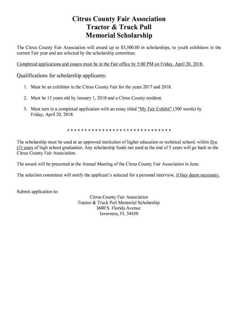 Citrus County Fair Association Tractor & Truck Pull Memorial Scholarship The Citrus County Fair Association will award up to $3,500.00 in scholarships, to youth exhibitors in the current Fair year