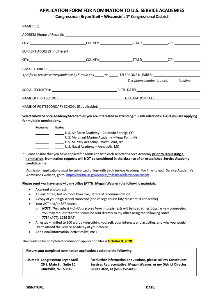 APPLICATION FORM FOR NOMINATION TO U.S. SERVICE ACADEMIES Congressman Bryan Star Wisconsin's 1st Congressional District NAME (full): ADDRESS (Home of Record): CITY:COUNTY:STATE:ZIP:COUNTY:STATE:ZIP:CURRENT